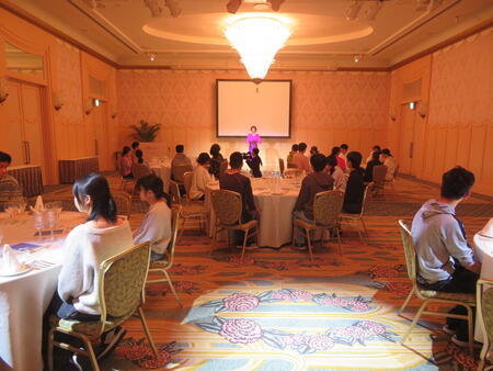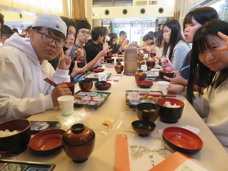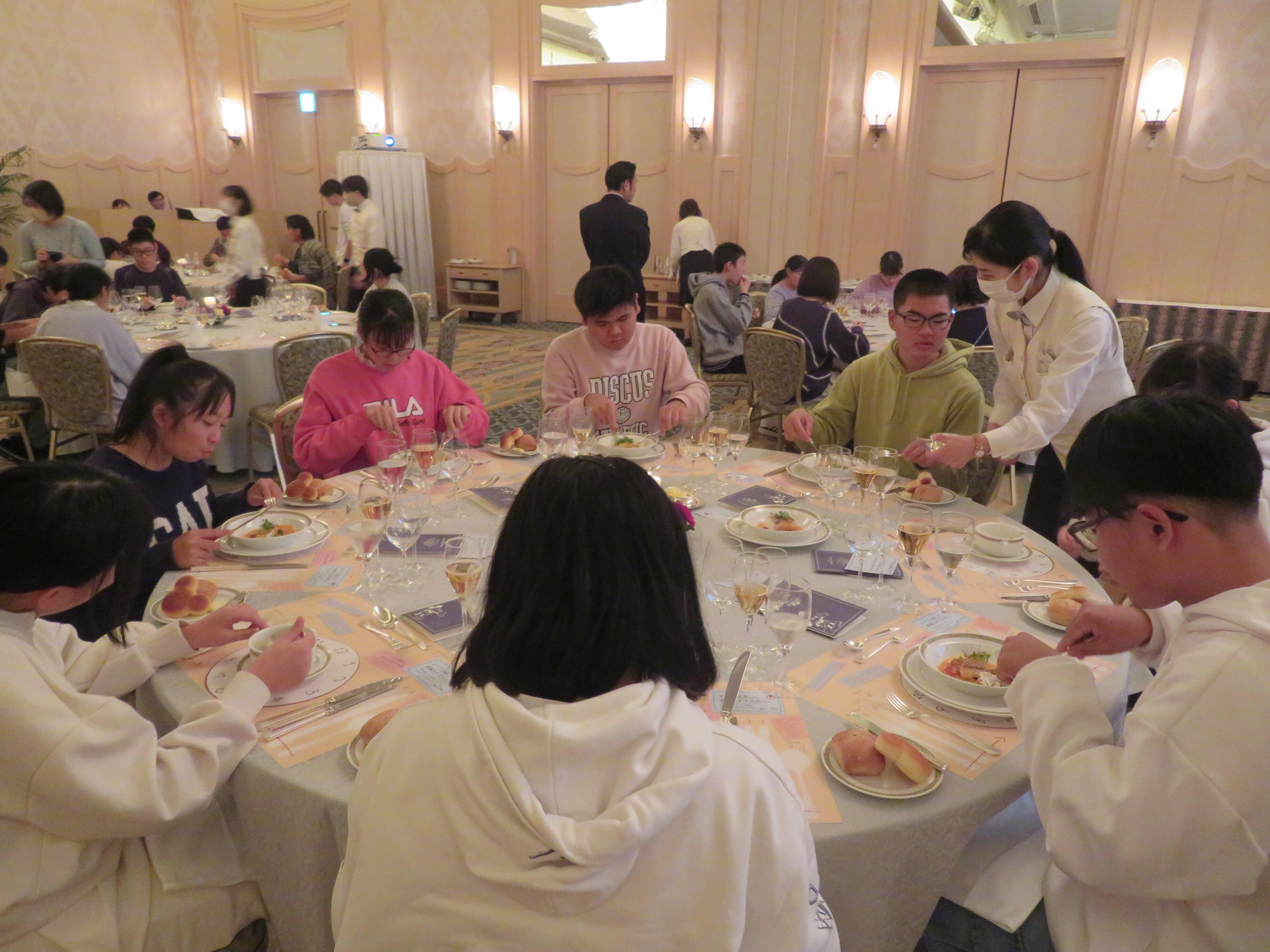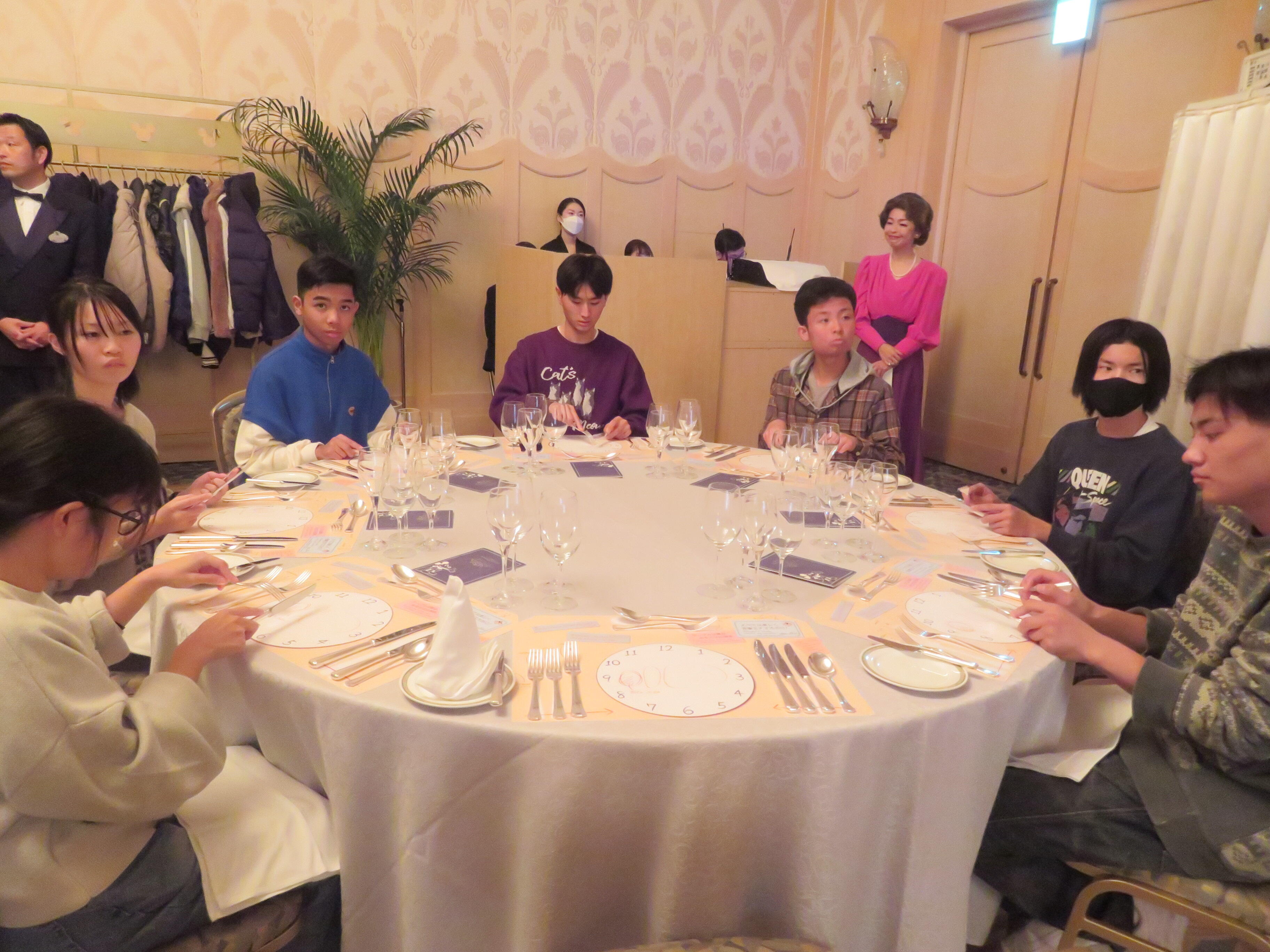 そして電車を乗り継ぎ、本日のメインイベントであるディズニーアンバサダーホテルでの「テーブルマナー講習」へ。「テーブルは舞台、あなたは出演者」を合言葉に、前半はカトラリー(ナイフやフォークなど)の位置や使い方を実際に手に取りながら学びました。また着席の方法や乾杯時のマナーについても学びました。そして後半はおいしいコース料理をいただきました。「レベル上がった!」「一生分勉強した!」という生徒もおり、とても深い学びになったようでした。
