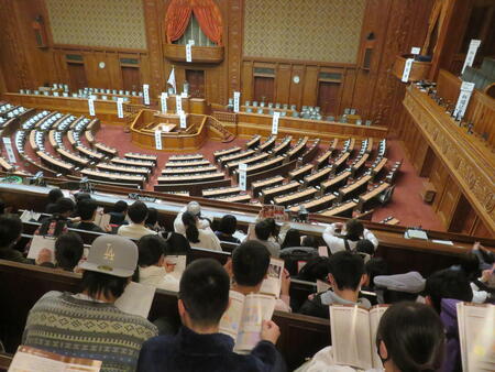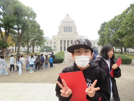 皇居正門二重橋前で記念撮影をしたのち、午後一つめの訪問先は「国会議事堂」。テレビニュース等でおなじみの議事堂ですが、テレビで見るよりはるかに威厳のある重厚なつくりに生徒たちは感心の声をあげていました。