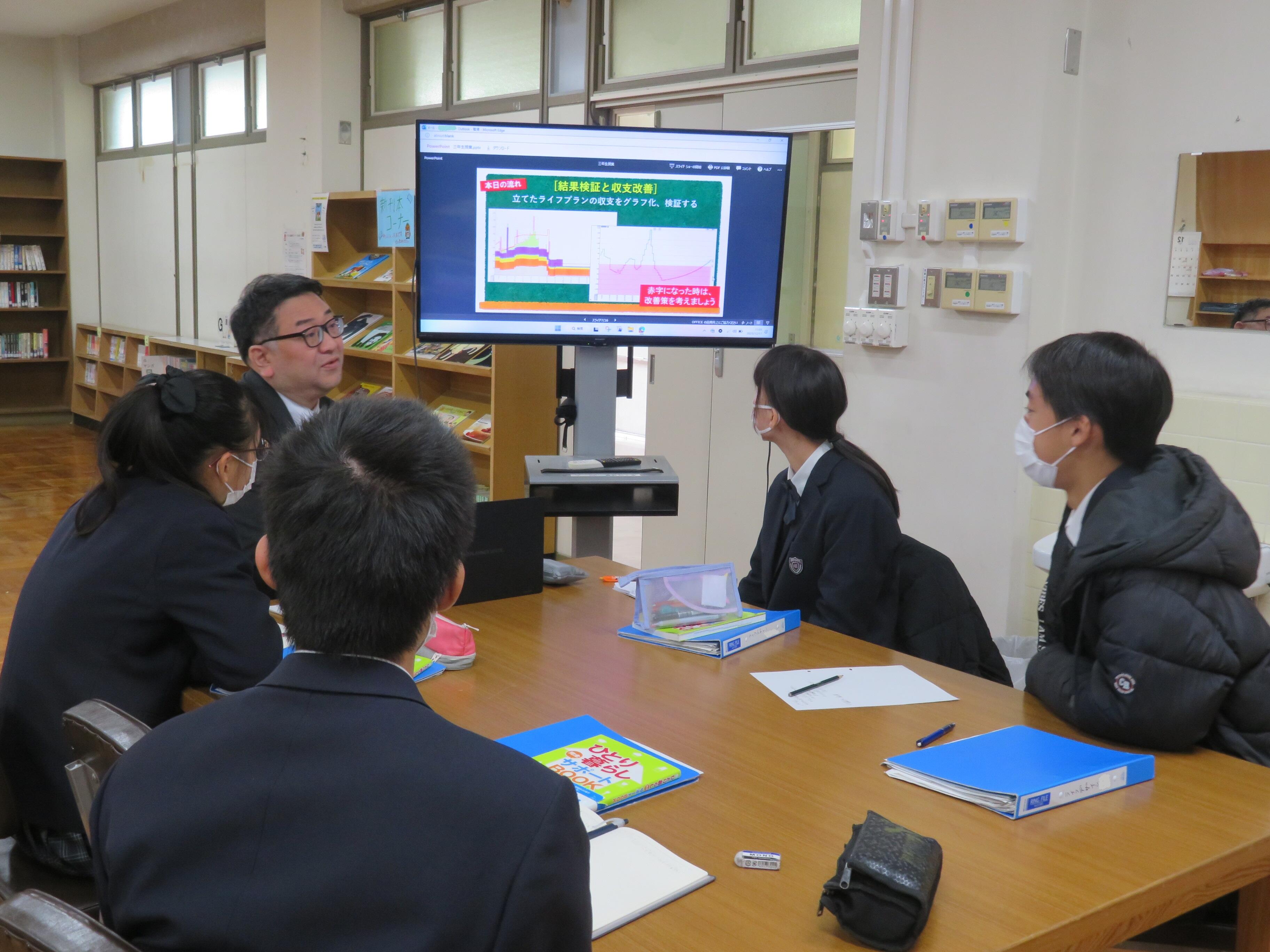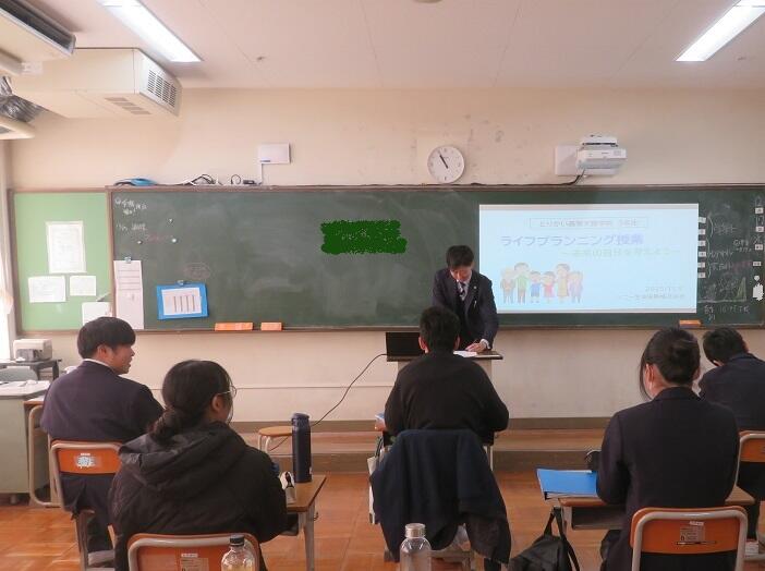 毎年この時期に恒例となっている3年生のライフプランニング講座を実施しました。今年度も「ソニー生命保険株式会社 大阪中央ライフプランセンター第1支社」の第1営業所長 織田 智己 様はじめ、6人のファイナンシャルプランナーの方々にお越しいただき、卒業後の就労面及び生活面において、将来設計の方法を具体的に学ぶことを目的としてグループワーク等を行いました。