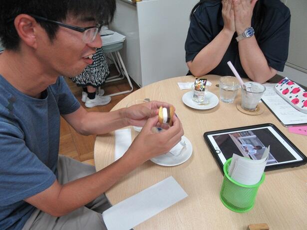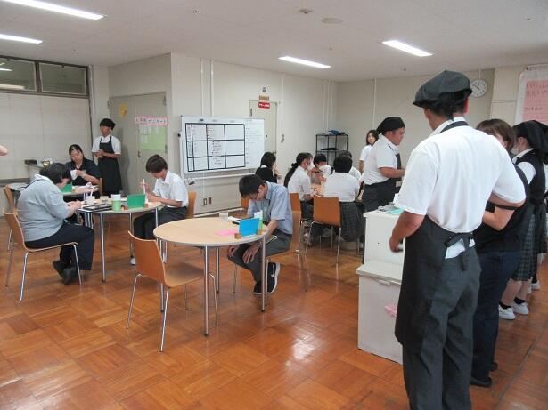 3年生の喫茶販売の授業では、夏限定のオリジナルメニューでお客様をもてなしました。その名も「お菓子な喫茶店」。メニューには「チョコマロクッキー」「雷アイスコーヒー」「プルンサイダー」といった、どれも試したくなる名前がずらり。既製品のお菓子を「生徒が制作した盛りつけ動画」を見ながらお客さんが自ら盛りつけていただくという新企画で、大繁盛でした。