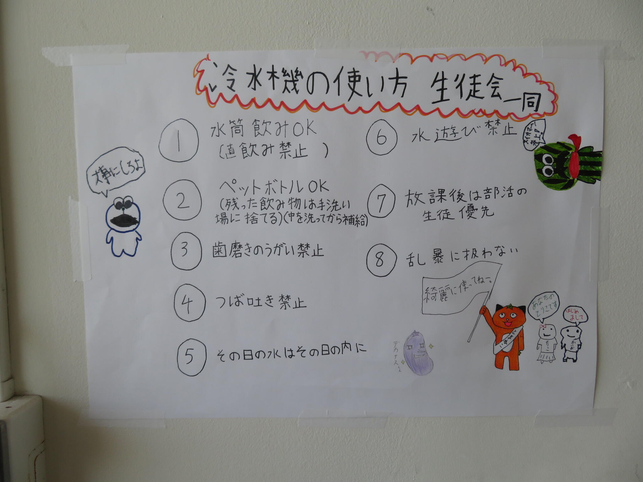 生徒会の要望もあり、自販機前にウォータークーラーが設置されました。生徒会が自主的に使い方や管理方法についてポスターを作り、掲示してくれました。