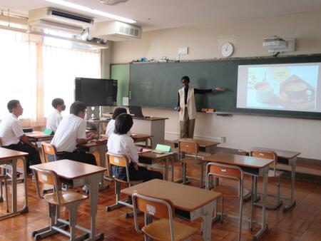外国語の授業において、NATIVE ENGRISH TEACHER(ネイティブ イングリッシュ ティーチャー)に出身国の文化などについて教えていただき、関連した内容を英語で会話するという取組みを行いました。(写真下は、北摂つばさ高校での様子)