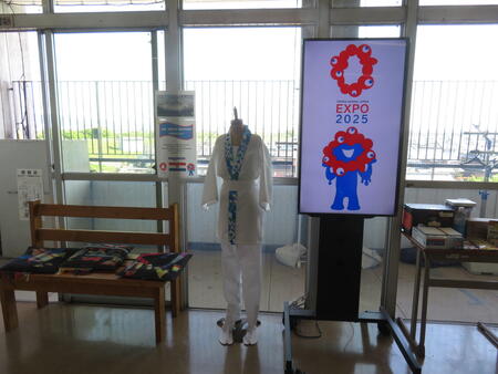 開会式に参加した生徒から衣装をお借りし、校内で展示しました。万博期間中には校内のあちこちに手作りの関連グッズも展示されていて、機運が高まりました。