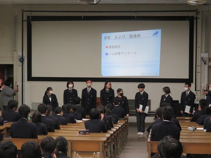 続いては恒例の表彰です。「日本語ワープロ検定」「プログラミング技能検定」「文章入力スピード認定試験 日本語」にチャレンジして認定を受けた生徒を表彰しました。今回残念ながら認定にいたらなかった生徒も含め、そのチャレンジ精神に拍手を送りたいと思います。よく頑張りました!