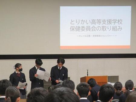 そして全校集会の締めは、1月21日(水)に予定されている「学校保健発表大会」に参加する生徒保健委員会からの報告でした。~キレイは正義!清掃戦隊とりレンジャー!~と題して、校内における清掃等の取組みの紹介がありました。発表大会に向けた練習も兼ねての紹介、とてもわかりやすく「これからもキレイにしよう!」との思いの伝わる発表でした。保健委員会の皆さん、大会での発表、緊張することと思いますが頑張ってきてください!
