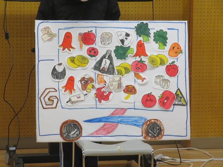 3年生はこれまで、プレイルーム・中庭での遊びやパネルシアターをとおして交流を行ってきました。 本日は「摂津支援お弁当バス」のパネルシアターです。