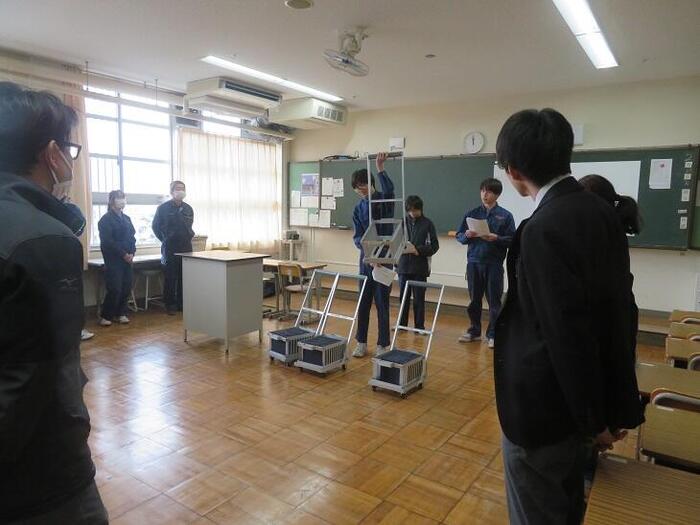 2月9日(月) 4・6限 共生HR教室にて 生産技術科11期生(3年生)が卒業記念に製作した「iカート」を4台寄贈してくれました。 本日は、そのお披露目会。4限と6限の2回「iカート」の高い性能や製作秘話?について、教職員に紹介してくれました。 会場からは「すごい!」「軽い!」「小回り効く!」「美しい!」「役立ちそう!」「うれしい!」などといった賛辞の嵐。私もタブレット入りのカートを引かせていただ...