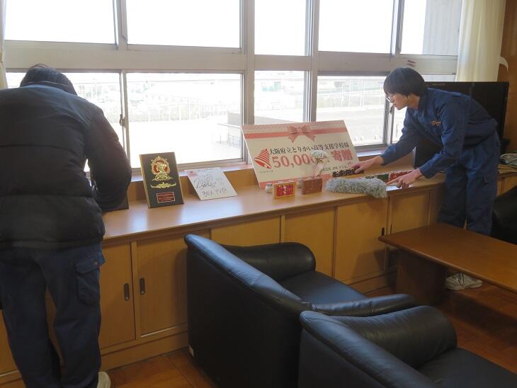 清掃チームは卒業を控え、スカイルーム・食品加工室・視聴覚室・理科室といった特別教室を主体的に清掃してくれています。本日は、12月に申し出をいただいていた校長室の清掃に来てくれました。