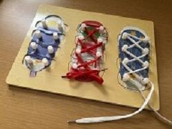 今回は、自立活動的なもので、紐結びや紐通しの練習をする教材です。様々な靴のイラストを用いたり、紐を通すと線路になったり、児童生徒の興味に合せて使用できます。フェルト生地と紐だけで作成することができる教材もあります。
