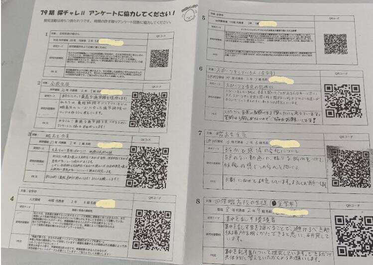 次回の探究で配付するアンケート協力用紙の作成も行いました。アンケートが必要なチームは事前に担当の教員に確認してもらったGoogle FormをQRコードにしてGL部に提出します。GL部の方でまとめて、印刷して全校生徒に配付し協力を依頼しています。