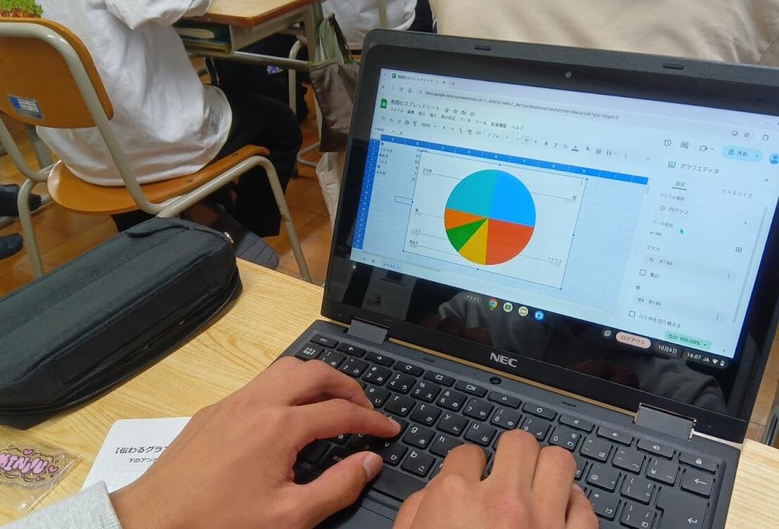 今回の探究チャレンジでは、夏の探究活動を振り返り、もっとよいまとめ方・見せ方をするためにはどうすればよいのかを学びました。文字だけで表そうとするよりも、写真やグラフを適切に入れることで、読む人の理解は格段にあがります。実験結果の数字をただ並べ立てるよりも、中央値・平均値を共に表示することでイメージは変わるだろうし、数学で学習するような分散や標準偏差を一緒に表せば、さらにデータのイメージが付きやすくなります。説明を聞いた後は、実際にChromeBookを使ってグラフを作ってみました。