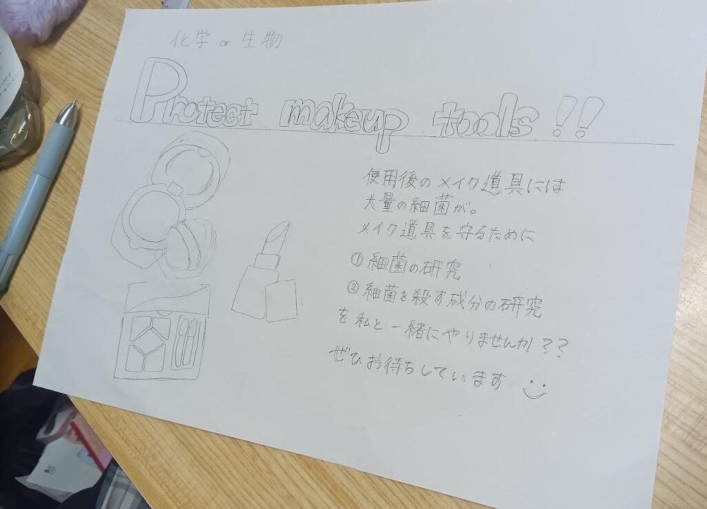 本日の探究では「マッチング」の時間に必要な「自己紹介カード」を作成しました。自分の興味・関心あるキーワードと関心あるアプローチをB4の用紙に書いて自己紹介カードをつくります。「自分は一体何が好きなんだろう」とペンが止まりなかなか書けない姿も見られました。「文字」にして自分はこれが好きと見せるには、納得できるものを書かなければならないので、自分を見つめるよい時間になりました。高校1年生にとって難しいことかもしれませんが、自分を知ることはとても大切なのでしっかり時間をかけて、自分探しに取り組んでほしいです。