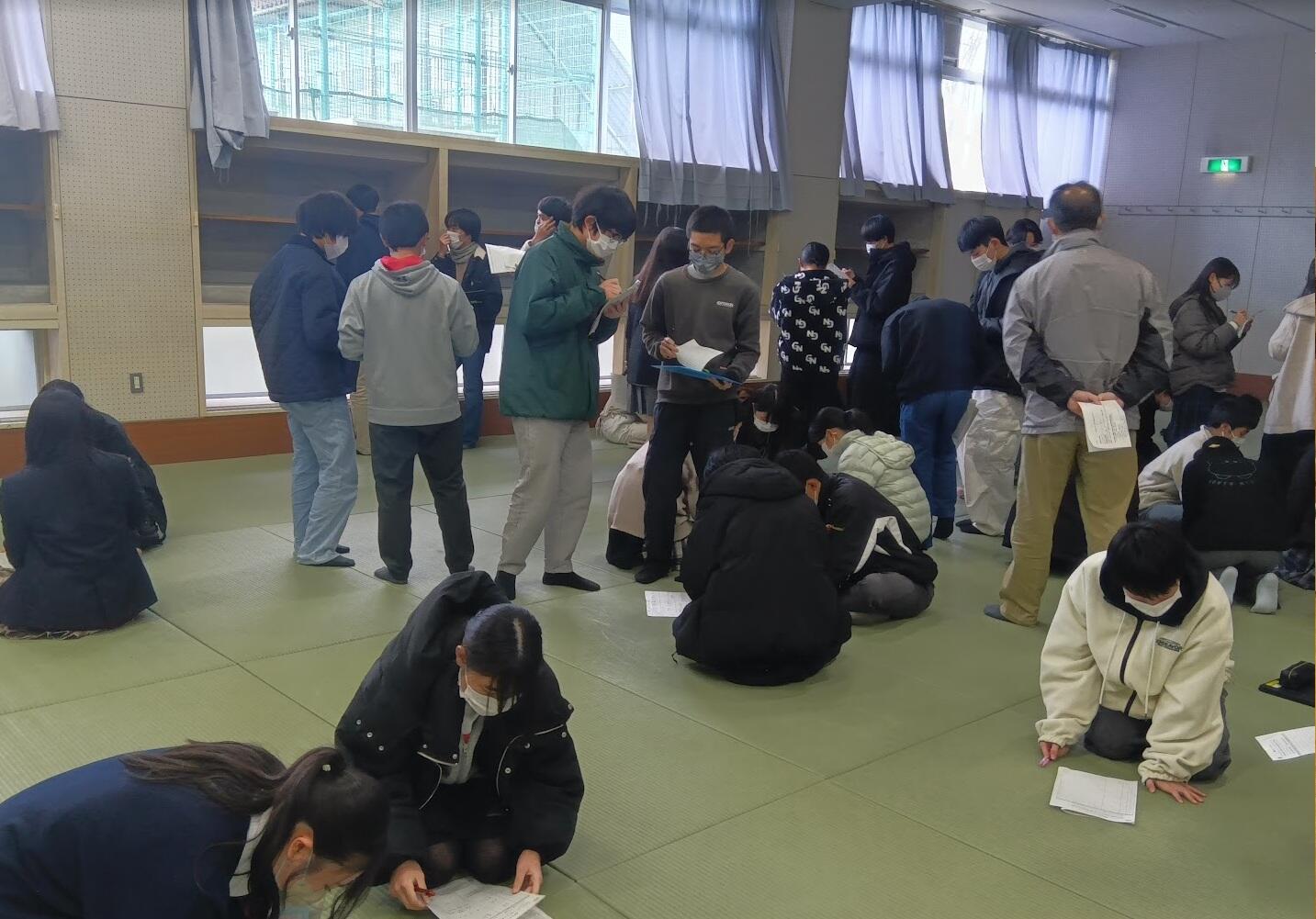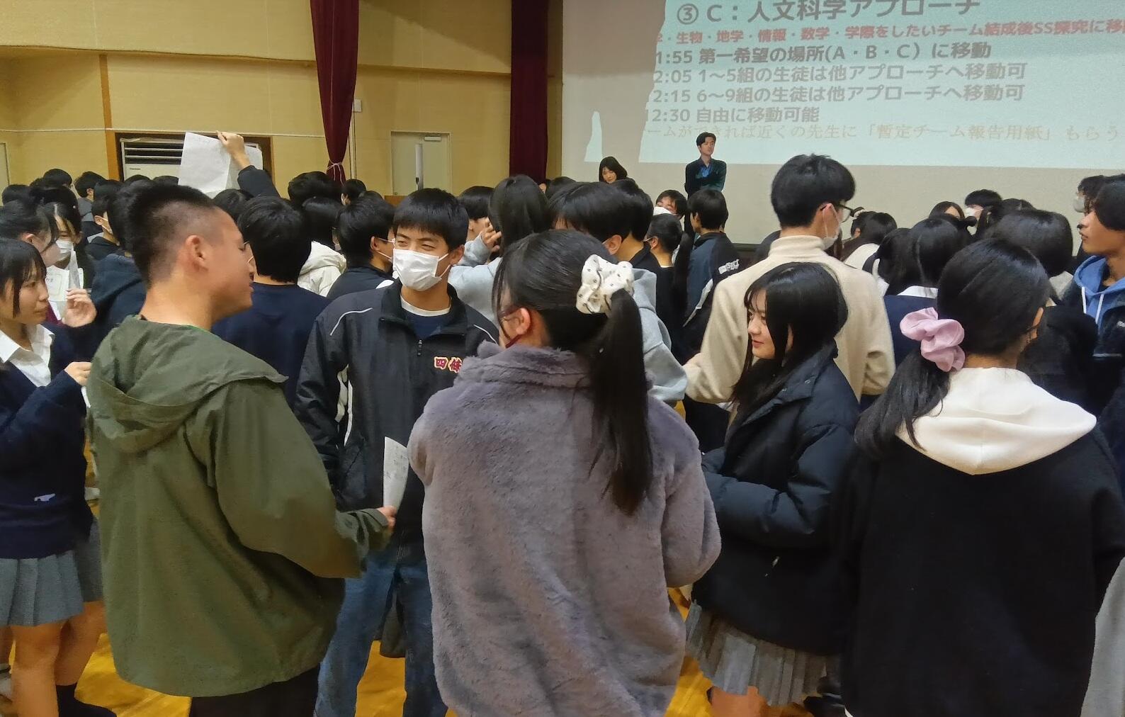 インフルエンザの影響で延期したマッチングですが、今回の探究チャレンジで無事に行うことができました。課題探究コースは鹿深野に集まり、本日の流れの説明を受けた後、関心あるアプローチの前に集まり、色んな人の自己紹介カードを見ながら話しあいました。開始5分くらいはあまり動きもなく心配していましたが、20分くらい経過すると徐々にグループができだし、集まって話し合う姿が見られるようになりました。初対面の人にも自分はこんなことがやりたくて、こんなことに興味があって、と話している姿は本当に素晴らしい畷高生の姿だと思います。