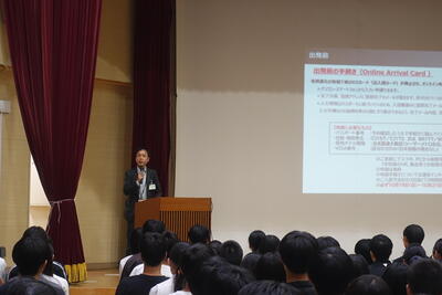 修学旅行委員の司会で、行程の説明や諸注意、旅行社からの説明、付添教員の紹介などありました。