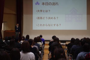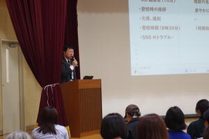 5時間目に第1学年PTA学年集会があり、学年副委員長様の司会で、校長あいさつの後、進路指導部から進路状況について、教務部から文理・科目選択等について、旅行社から来年の海外修学旅行について、最後に学年主任からの話がありました。