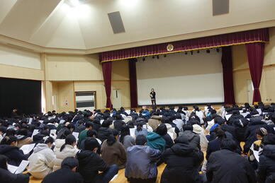 本日、明日から行われる大学入学共通テストに向けて、78期生(3年生)が鹿深野ホールに集まりました。