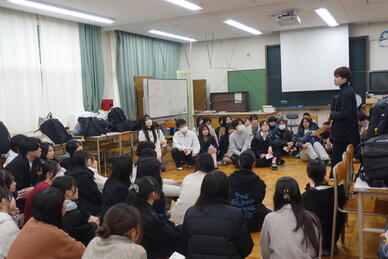 最初に「世界が100人の村だったら」を使用し、世界の現状を知るワークショップを行いました。その後卒業生と生徒が交流し、楽しくも有意義な時間を過ごしました。
