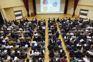 第一部として新2年・3年の学年別に「子どもたちの夢の実現に向けて~保護者としての心構え」というタイトルで外部講師の方による講演が行われました。最新の進路情報、リアルな大学選びのポイントなど、ユーモアを交えたわかりやすいお話をしていただきました。私自身も十数年前、息子二人が受験生であったことを思い出しました(いろいろ大変でした)。そして、改めて生徒たちの進路実現には、ご家庭と学校の連携が本当に必要だと感じました。