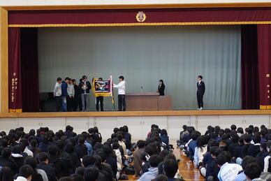 男子ソフトテニス部、合気道部の健闘を表彰しました。その後、進路指導部、生活指導部よりお話があり、最後に文化祭中央実行生徒会と生徒会執行部からの連絡があり式を終えました。