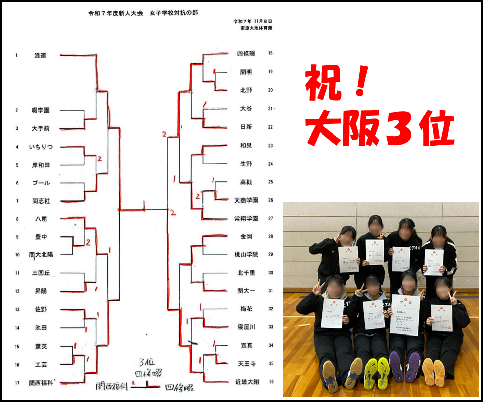 11月8日(土)に実施された大阪高等学校新人卓球大会(女子学校対抗)において、本校がベスト4(第3位)に入賞し、見事冬の近畿大会に出場を決めました。