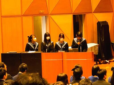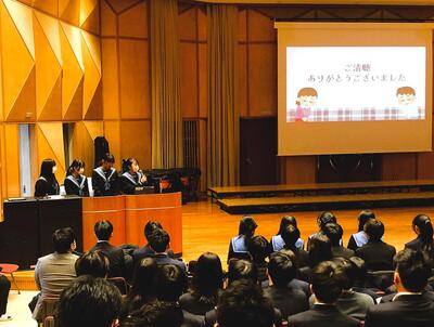 13校が参加し夕陽丘高校で行われた高校生探究発表会において、本校の2年生4人が探究テーマ「ラブソングに登場する通信手段から読み解く人々の心情の変化」について発表を行いました。ラブソングの歌詞の傾向を通信機器の変遷から記号的に読み解き、次に流行るラブソングの歌詞の傾向を予想するという内容で、そのユニークな着眼点と解析がアドバイザーの方々や聴衆の方々の興味と大きな関心を引いていました。
