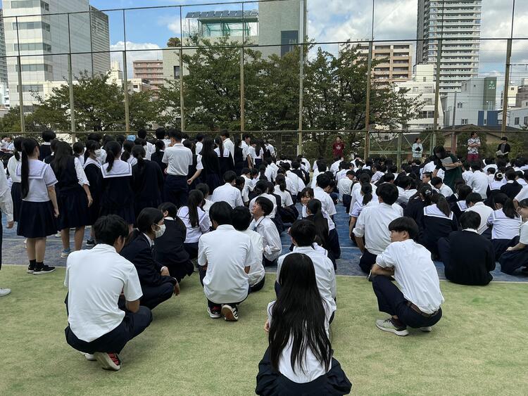 教頭先生からは、実際に災害が起きた場合も放送をよく聞いて行動する事、移動教室の授業中でも、安全に避難行動を行いテニスコートに集合してお互いの安全を確認する事などお話がありました。