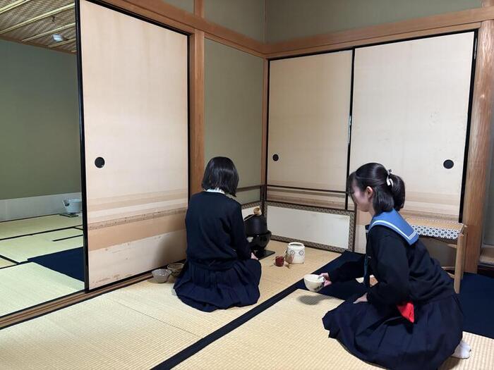 校舎2階へ。 作法室で茶道部が活動していました。 顧問の先生に作法を学びながら、部員同士でお茶を出し合っていました。 作法のひとつひとつが細かく、大変そうですが、ほどよい緊張感はありつつ、楽しそうにやっていました。 以前、お茶会に招かれた時もその丁寧な作法に感心しました。すごい。 つづいて、被服教室。家庭科部が活動していました。 縫物したり、ミシンでポケットティッシュカバーを作ったりしていました...