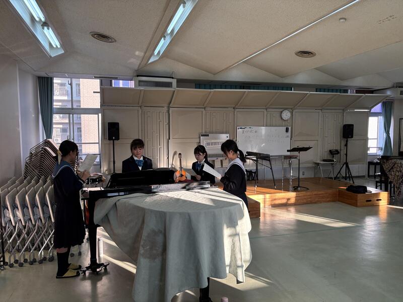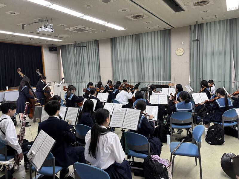 視聴覚教室でオーケストラアンサンブル部が活動していました。