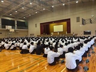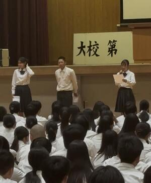 始業式終了後は、9月26日実施の体育大会の応援団長の3人が全校生徒の前で意気込みを語ってくれま