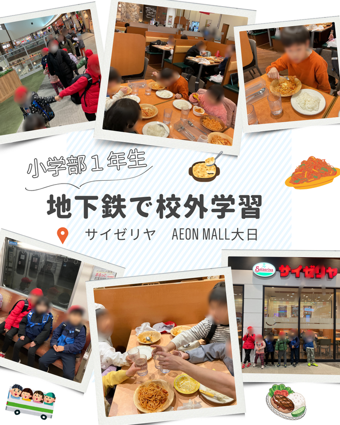 小学部1年生は、AEONモール大日のサイゼリヤに校外学習に出かけました!初めて、みんなで地下鉄に乗りました🚃サイゼリヤでは、みんなたくさん食べて「おいしい😋」や「おなかいっぱい〜❤️」と言いながら満面の笑顔🥰とても楽しんだ校外学習でした😁