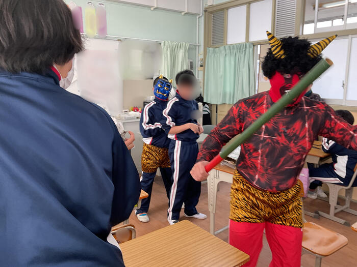 小学部みんなで集まって、節分の集いを行いました👹 最初にお話しを聞いたり、歌を歌ったりしました🎵 鬼を見て、びっくりする子!豆に見立てたボールを鬼に思いっきり投げる子などとても楽しく過ごしました。