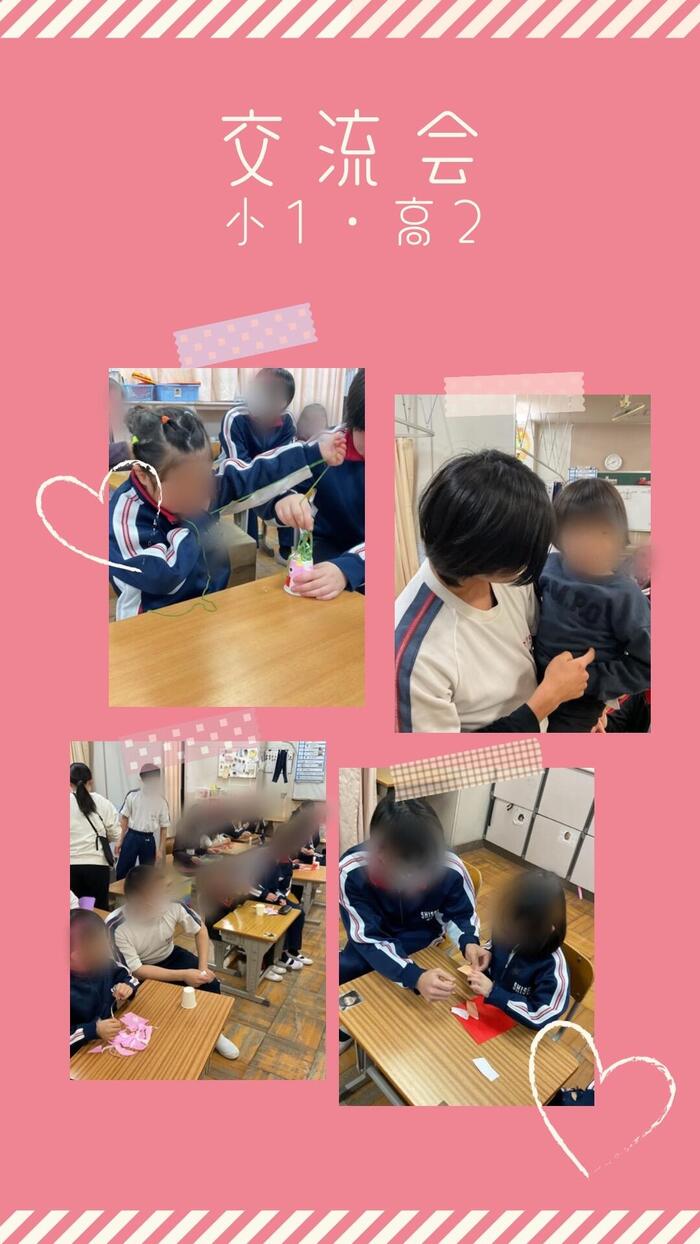 小学部1年生と高等部2年生が交流学習をしました! 紙コップで鬼を作りました。「何色がいい?」「上手やん〜」などの声が飛び交いながら、一緒に鬼を作ってとっても楽しそうでした。終わってからは、おんぶしてもらったり、抱っこしてもらったりして遊んで、とても楽しい時間を過ごす事ができました☺️