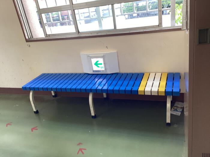 いつもみんなが登校してくる所と階段の所に壁があり、右側通行のポストがあります。