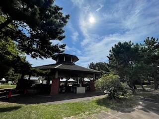 バス車内は、おしゃべりで盛り上がりました。「先生、お肉、焼いてあげる!柔らかく、フワフワに!」「はやくお風呂に入りたいな。」「公園、めっちゃ広い!明日、遊ぼうな!」と会話が弾みました。 10時55分、羽衣青少年センターに到着。宿舎正面で集合写真を撮影。そのあとは、BBQです。