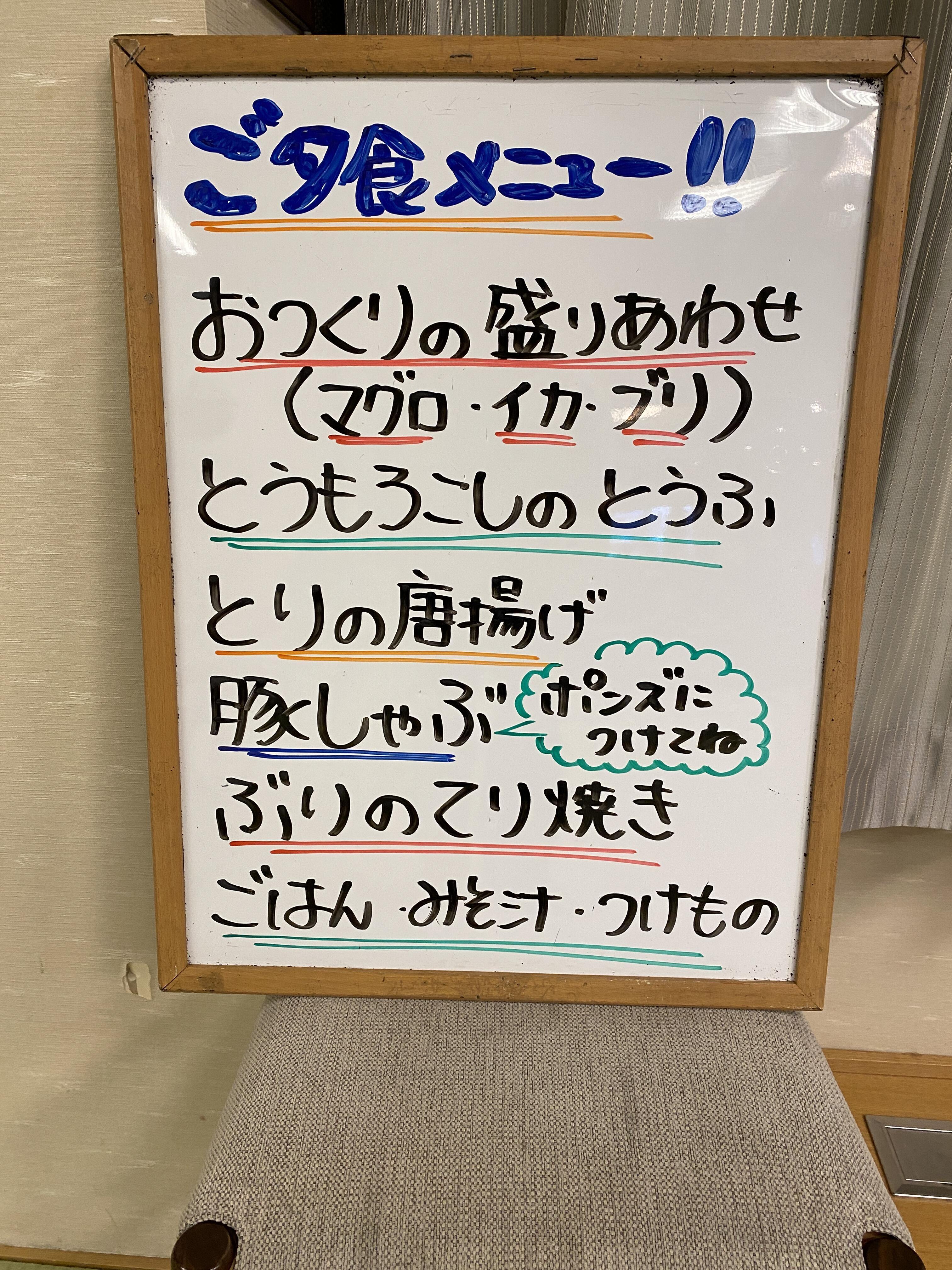 お風呂も終わり、みんなスッキリして今から夕食です。目の前のご飯にみんなワクワクして、座っています。あいさつのお友だちのおすすめは「唐揚げです。」の後に「いただきます。」で食べ始めました。