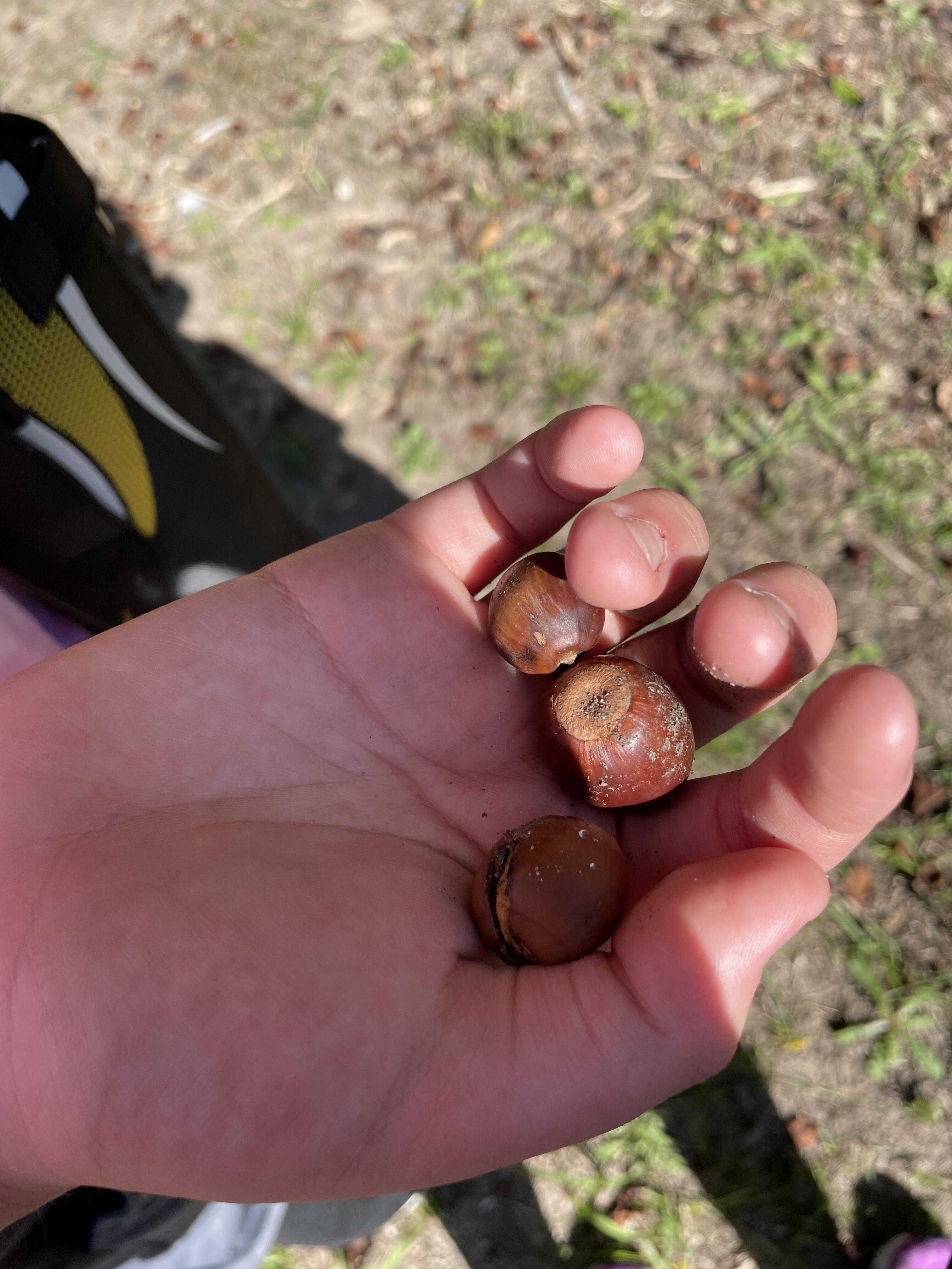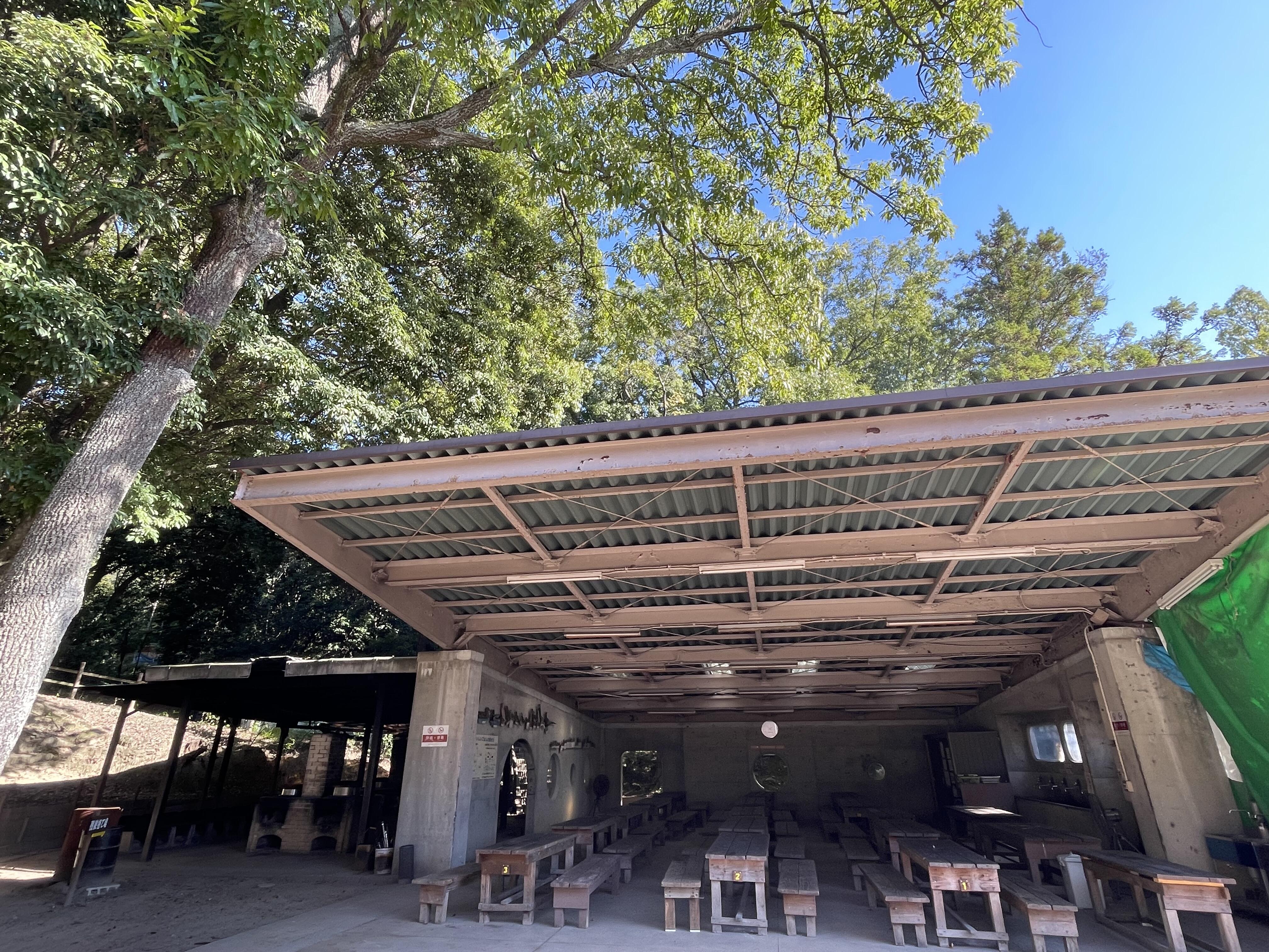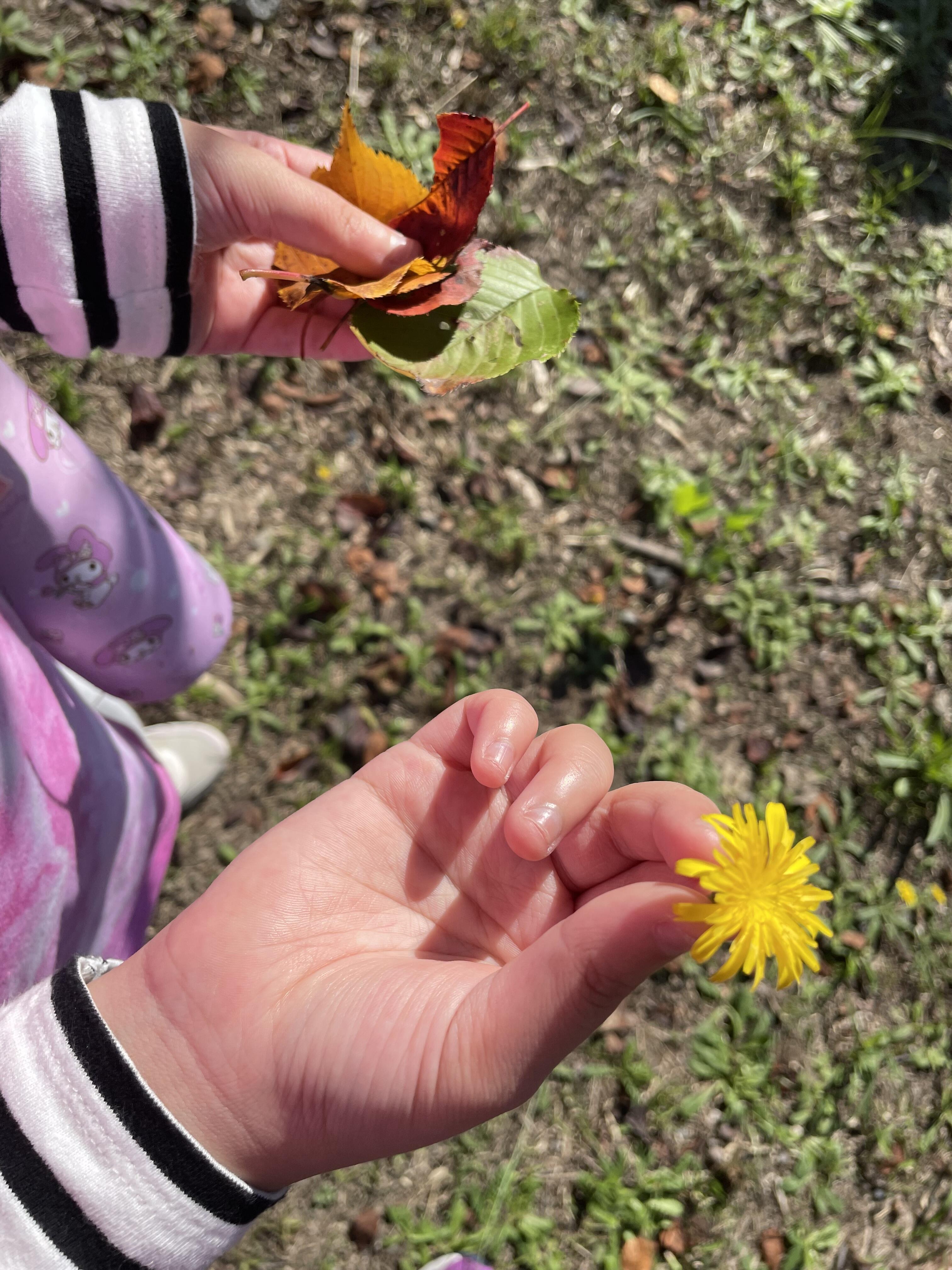 昼食でお腹いっぱい、しっかりエネルギーチャージ!休む間もなく、野外活動「はっぱあつめ散歩」へ出発しました。2班に分かれて、お友だちや先生と手をつなぎながら、元気いっぱいに歩きました。 青空の広がる広場では、色とりどりの落ち葉やドングリなどを拾いながら、秋の自然をたっぷりと感じました。少し汗ばむほどの陽気の中、笑顔いっぱいで活動を楽しむ子どもたちの姿が印象的でした。 宿舎に戻ると、野外自炊場でお待ちかねのおやつタイム!トタン屋根に「コン、コン、コン!」とドングリが落ちる音に少し驚きながらも、いつもと違う雰囲気の中でお菓子とジュースを味わいました。