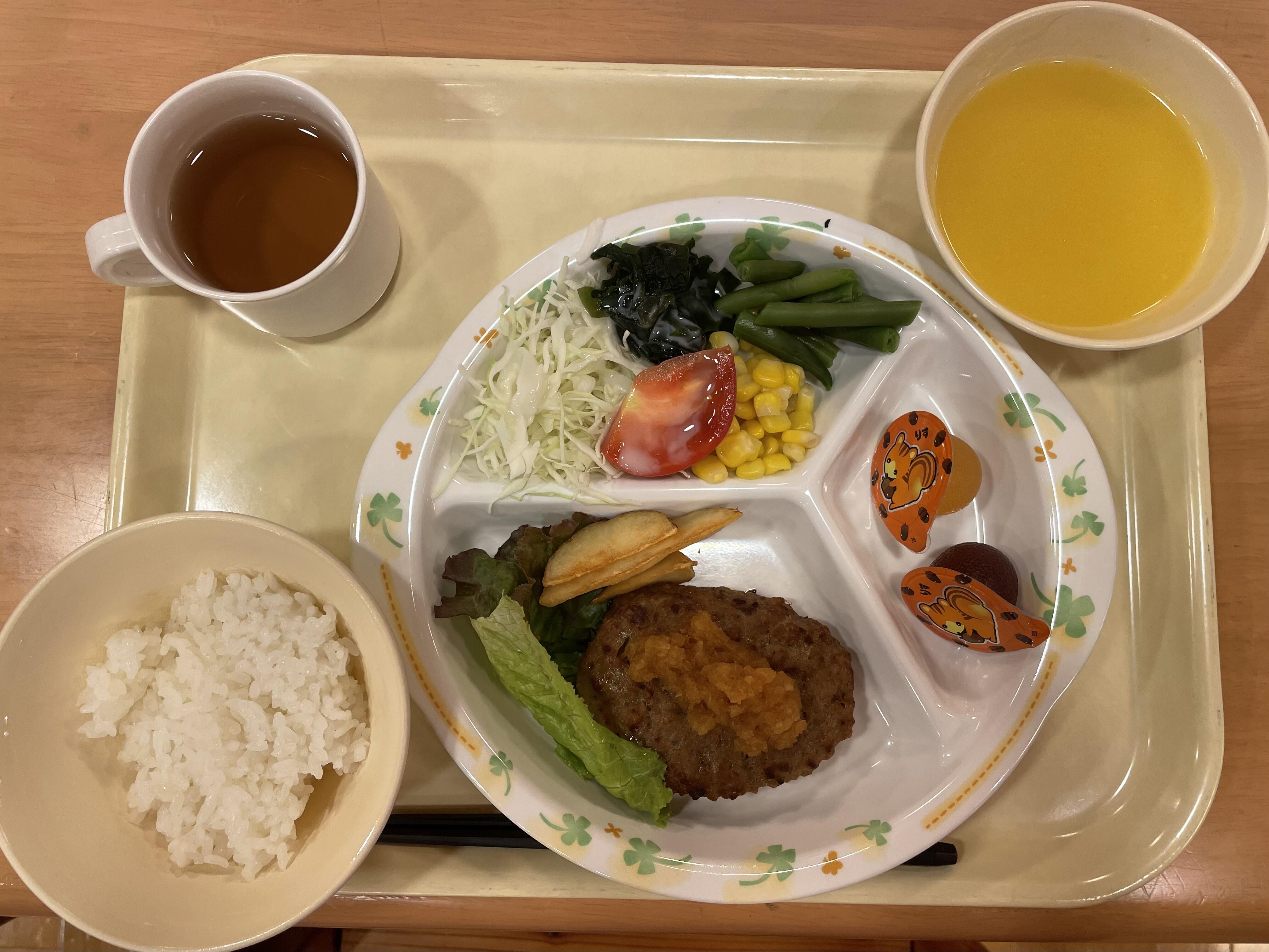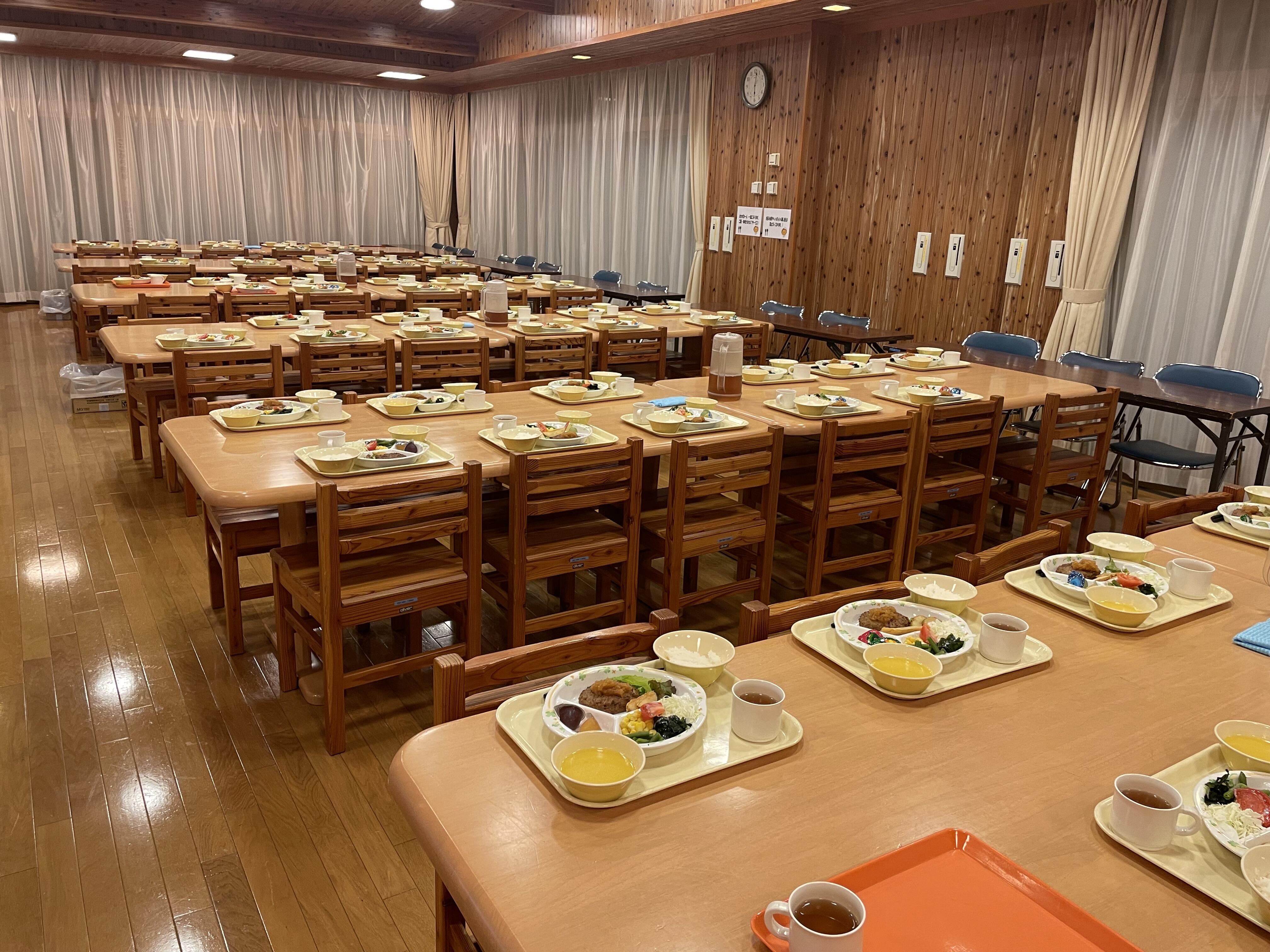 夕食の時間です。プレートを見て、「美味しそう!」と笑顔。あいさつ係の人が前に出て、「いただきます!」の合図。そして元気いっぱいの声で大合唱。
