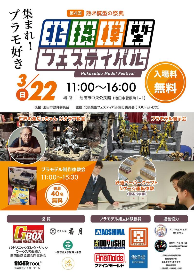 ご連絡が遅くなりましたが、本日(3/22)、池田市中央公民館にて開催される北摂模型フェスティバルに参加します。11:00~16:00となっていますので、生徒たちが頑張っている姿を見に来ていただけたらありがたいです。