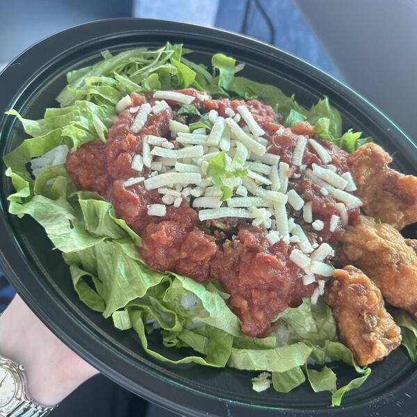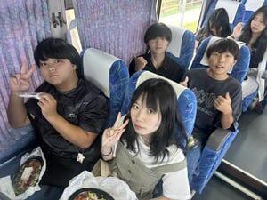 昼食は、お弁当が配布されました。タコライスです。学年主任は「タコライスだいぶ好きです」とのこと。バスの中で食べている人や21世紀の森ビーチで食べる人もいました。