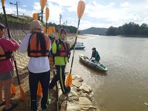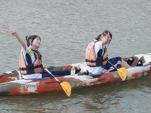 カヌーの漕ぎ方をすぐにマスターし、川から海へ出たあと、陸に帰ってきました!