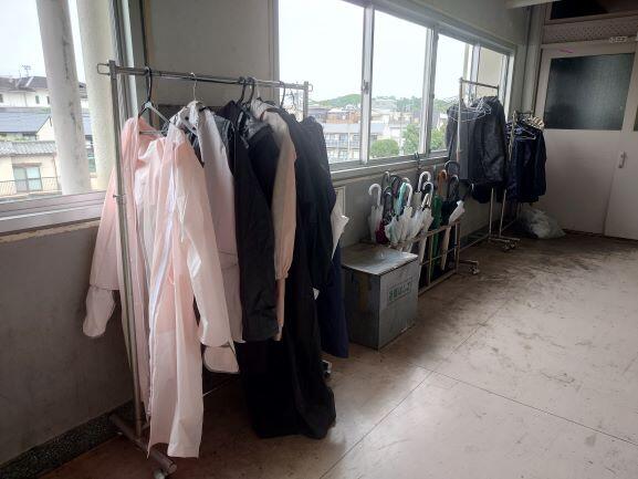 はやいもので4月も終わりの日となりました。少し肌寒く、あいにくの雨の日です。教室前廊下には生徒たちの雨合羽がハンガーラックにかけられています。 本校では多くの生徒のみなさんが自転車で通学をしています。そのため雨天時に通学で使用した雨合羽置き場のため、教室前にハンガーラックを設置しています。なかには自分の自転車にかけている生徒もいます。 今日は一日雨模様とのこと。くれぐれも帰宅時も気を付けて運...