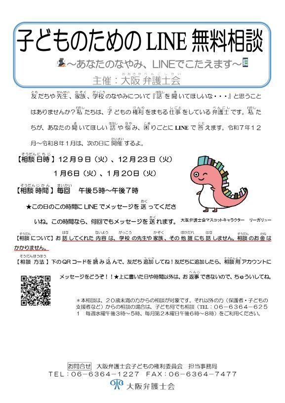 大阪弁護士会より、「子どものためのLINE無料相談」の案内がありましたので、校長だよりでもお伝えします。 子どもたちを取り巻く環境はさまざまで、学校は生徒たちにとって安全で安心な場所であらねばならないと強く感じています。先生たちはそんな生徒の良き相談相手、信頼できる大人としていつも学校にいます。 しかし、先生のいない夏休みや冬休みの長期休暇中に誰かに相談したくなったとき、社会には相談できる場...