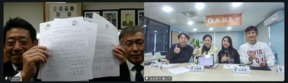 28日(水)に台湾の台北市立南湖(ナンフー)高等学校と本校との姉妹校提携の調印式を実施しました。 オンラインにて南湖高校の校長先生はじめ担当の先生方と対面し、双方の校長がMOU(覚書)にサインをし、データを送り合いながら調印式を執り行いました。 台湾の南湖高校は生徒数約1500人(本校のおよそ倍!)が通う普通科の高等学校です。ホームページ等を拝見すると校舎や教室はとても綺麗で、教育理念は「仁...