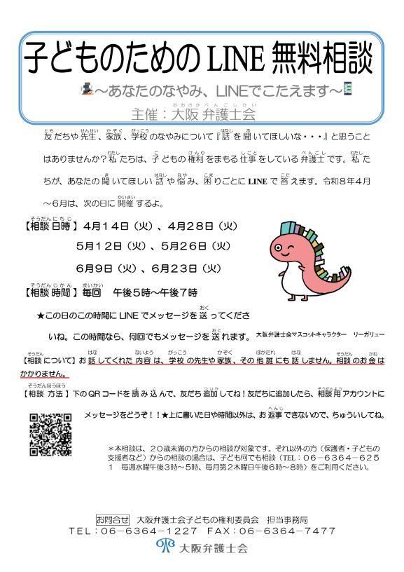 大阪弁護士会より、「子どものためのLINE無料相談」の案内がありましたので、校長だよりでもお伝えします。 子どもたちを取り巻く環境はさまざまで、学校は生徒たちにとって安全で安心な場所であらねばならないと強く感じています。先生たちはそんな生徒の良き相談相手、信頼できる大人としていつも学校にいます。 しかし、先生以外の誰かに相談したくなったとき、一人で悩まず社会には相談できる場所、方法、相手はた...