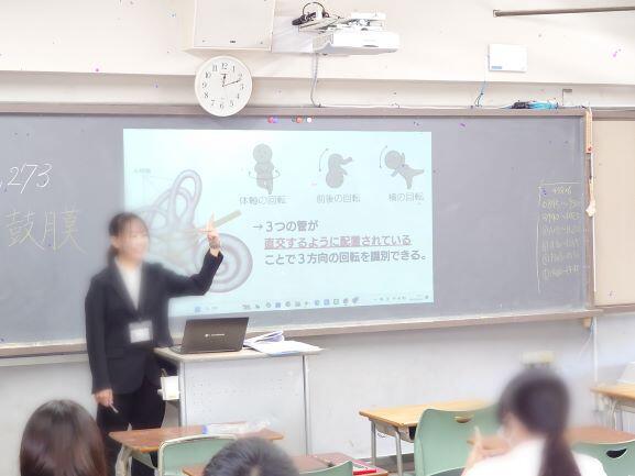 本日(22日)、本校に教育実習に来ている実習生が研究授業をおこないました。3年生の医療看護コースを選択している生徒たちの授業で生物の「刺激の需要と反応」という単元からヒトの耳のしくみを学びます。