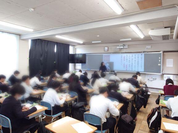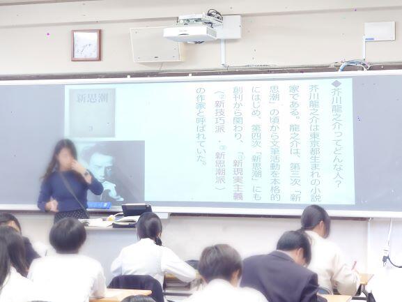 授業では著者芥川龍之介についての説明があり、誰もが知っている有名な「蜘蛛の糸」「鼻」など紹介後、有名な冒頭部分から時代背景や情景を思い浮かべることなど先生の丁寧な説明で生徒のみなさんの興味関心が高まる様子が伝わってきました。
