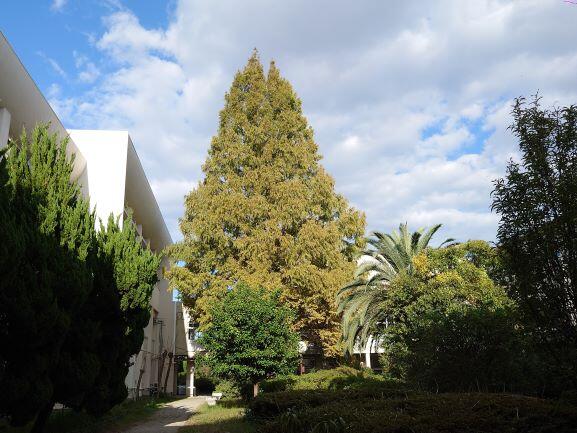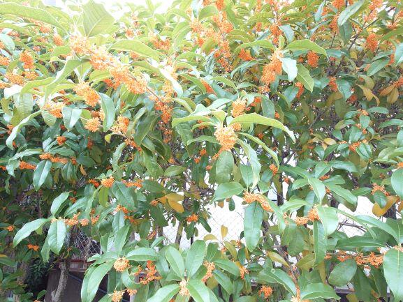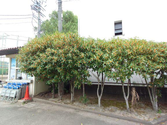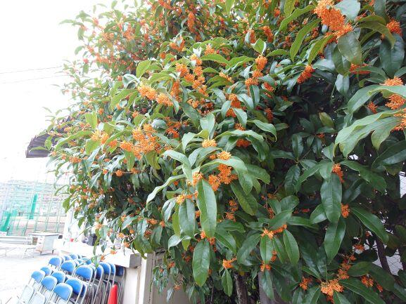 正門から入ってすぐ右側にある立派な金木犀(キンモクセイ)が開花しています。キンモクセイは9月下旬から開花時期に入り、この橙色の花はおよそ1週間で散るとのこと。その甘い香りは秋を感じさせます。キンモクセイの他、校内の木々も色づいており、空高く爽やかな秋晴れで気持ちの良い日和となっています。
