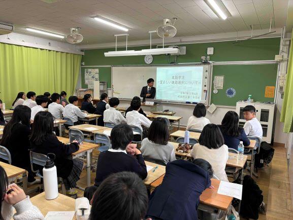 吹田二中の進路特活の時間に訪問させていただきました。本校の教員が中学3年生のみなさんに来春から始まる高校生活について、そして今、進路の実現に向けて考えてもらいたいことなどお話させていただきました。