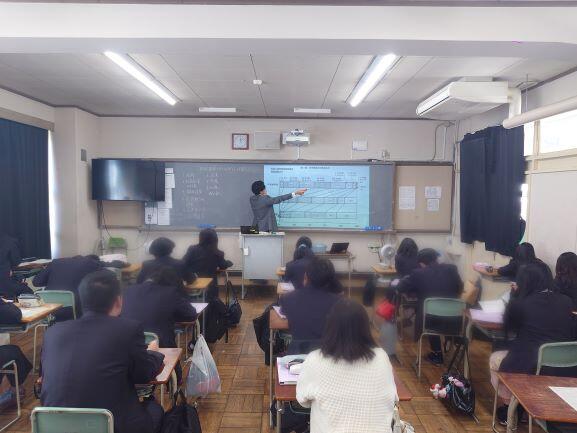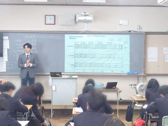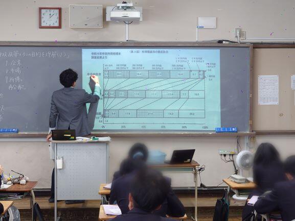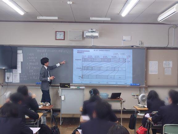 授業では、給料明細などを教材に、身近なものに例えて基礎から説明をしていました。日ごろあまり使わない用語がたくさん出ており、基礎がわかっていないと難しく感じることもあるでしょうが、そこは高校3年生、しっかり身に付けてもらいたい分野であり、世の中の動向にも興味をもってもらいたいと思います。