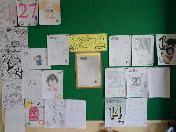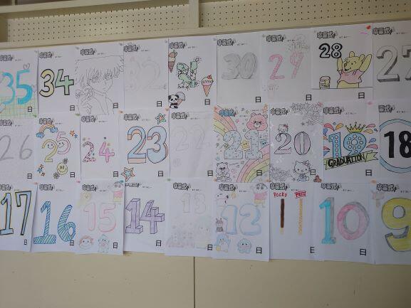 そして、3年生の教室前には、卒業式までのカウントダウンが貼られています。色とりどりの個性豊かなカウントダウンは3年生のみなさんを表しているようです。